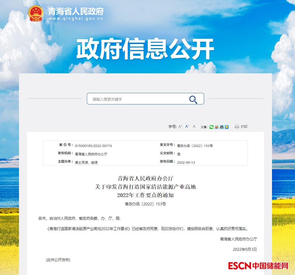 文件指出,2022年6月8日印發(fā)的《青海省人民政府辦公廳關(guān)于印發(fā)青海打造國家清潔能源產(chǎn)業(yè)高地2022年工作要點的通知》(青政辦函〔2022〕74號)同步作廢。
