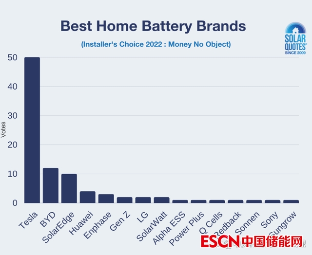 特斯拉保持了2021年第一名的地位,他們的Powerwall家用電池系統(tǒng)獲得的票數(shù)超過了所有其他品牌的總和,這是一個堅實的勝利,一位安裝人員評論說:“只有特斯拉?!?