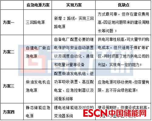 礦區(qū)應(yīng)急電源的選型要依據(jù)礦區(qū)的實際情況,從安全性、經(jīng)濟性、實用性、可靠性等多各方面考慮,確保備用電源真正起到作用。目前國內(nèi)礦區(qū)使用的備用電源類型主要包括引入第三電源、自備電廠、靜態(tài)儲能、車載柴油發(fā)電機四種形式。