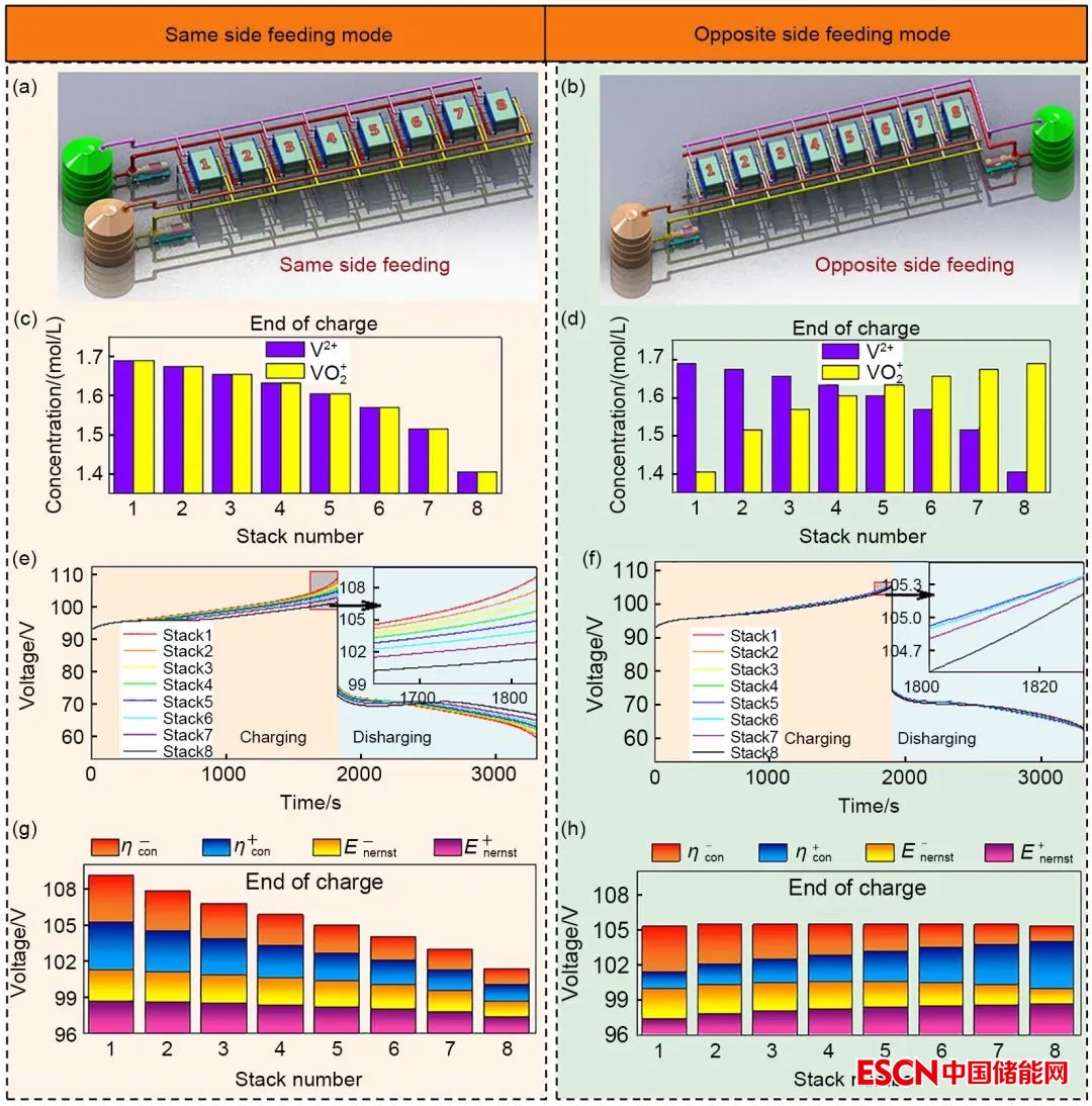 圖12 兩種不同電堆排布下的模塊電壓曲線和循環(huán)性能模擬與比較