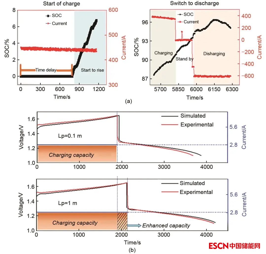 圖10 傳輸延遲對250 kW模塊SOC的影響(a) 及單電池條件下傳輸延遲實驗與預測比較(b)