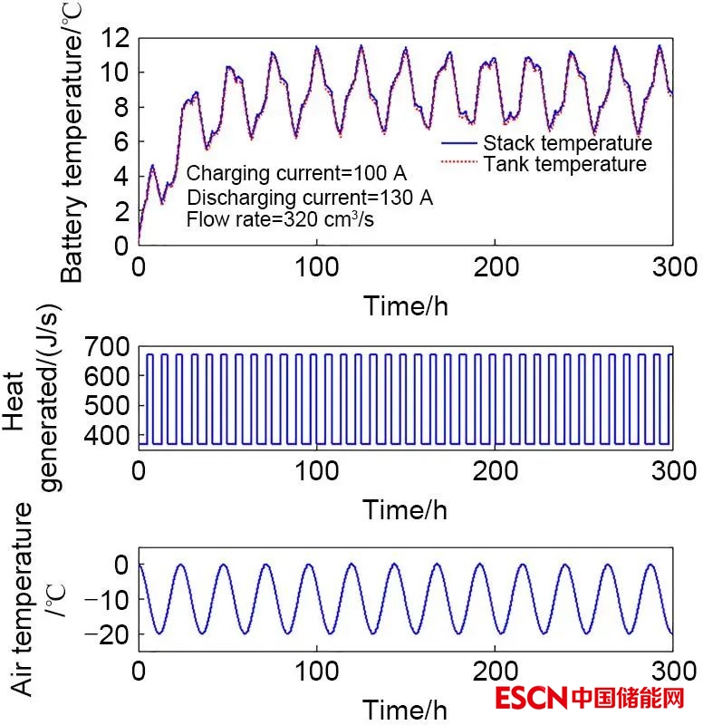 除有限元分析之外,Tang等還首先提出了全釩液流電池時域下的動態(tài)機理模型,該模型基于質(zhì)量守恒定律和菲克擴散定律,結合能斯特方程,可準確描述電池充放電條件下正負極各價態(tài)釩離子透過離子膜向異側(cè)溶液擴散的過程。結合不同種類離子交換膜擴散系數(shù)的實驗數(shù)據(jù),該模型實現(xiàn)了全釩液流電池容量衰減的動態(tài)分析和預測。而液流電池動態(tài)模型的建立,不僅可以預測電池容量隨充放電反應進行的演化規(guī)律,同時可指導容量再平衡和液流電池控制系統(tǒng)的設計。進一步,Zhao等還充分考慮了溫度對擴散、溶液體積遷移速率以及流體阻力的影響,利用動態(tài)模型更加深入系統(tǒng)研究了容量衰減、體積遷移和壓降的變化規(guī)律,并分析了不同流量對溶液溫度和電池性能的影響,相關研究為進一步理解液流電池動態(tài)特性及其對電池性能的影響機制提供了參考依據(jù)。