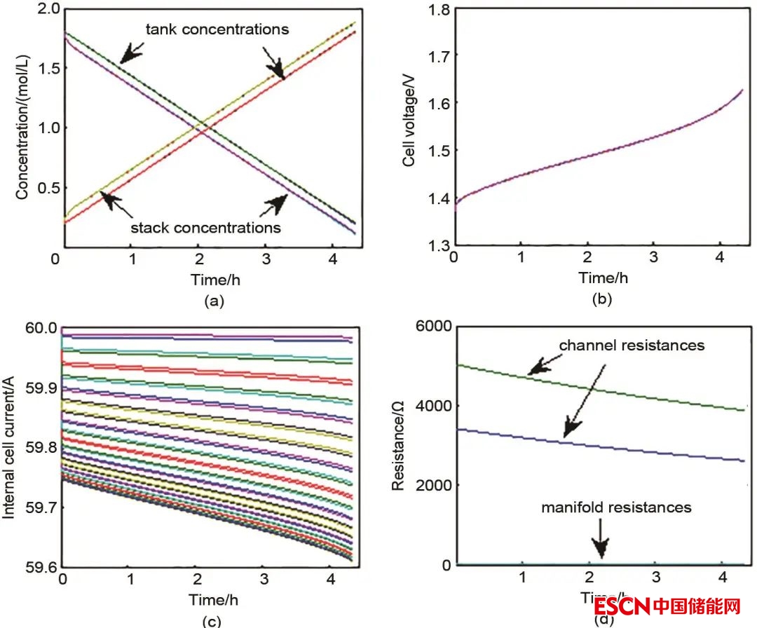 圖7 電堆在60 A充電條件下的模擬仿真結果(a) 濃度變化;(b) 電堆內(nèi)單電池電壓變化;(c) 旁路電流影響下的各單電池電流變化;(d) 管路與流道內(nèi)阻變化