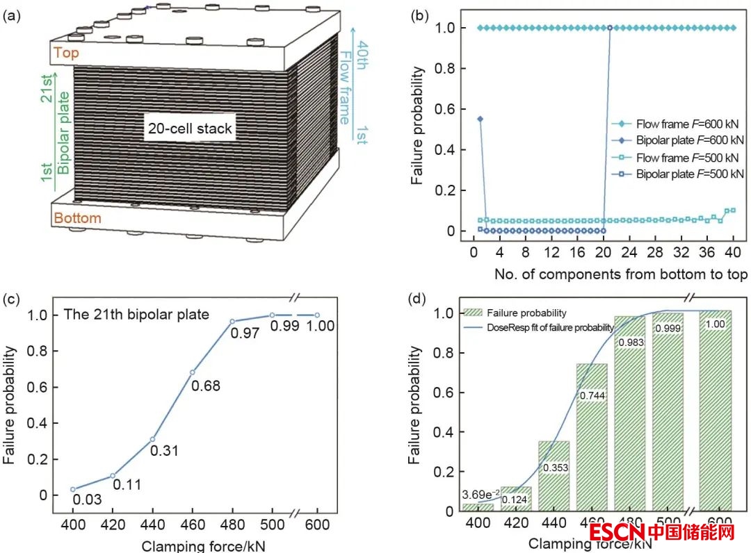 在此基礎上,Xiong等進一步利用數(shù)值仿真方法,針對單體電堆提出了基于Weibull分布特性的量化失效概率的評價方法,可實現(xiàn)特定結構電堆在不同裝配力下失效概率的計算與評估。研究首先對電堆中容易發(fā)生機械失效的雙極板和導流板進行了力學性能測試,獲得了其相關的力學性能參數(shù),在此基礎上引入Weibull統(tǒng)計理論,利用測試得到的關鍵組件的Weibull參數(shù)對電堆進行了機械失效統(tǒng)計分析,獲得了電堆的機械失效概率;此外,研究還對比了20組電池電堆中間加厚板和不加厚板兩種結構設計,通過Weibull統(tǒng)計理論計算了兩種電池堆的機械失效概率,得到了最優(yōu)的電池結構設計(圖6)。電堆的力學狀態(tài)不僅影響電池中各組件的機械行為以及電堆的失效概率,也會對電池內(nèi)部的電化學反應特性產(chǎn)生影響,進而影響電池的電化學性能。為了進一步研究電池的力學狀態(tài)對電化學特性的影響,Xiong等對單電堆建立了力學與電化學耦合模型,系統(tǒng)分析了不同裝配力對電池的電化學特性如歐姆極化、活化極化以及濃差極化的影響,研究了不同裝配力對電池的電壓以及功率密度的影響機制,并將電化學特性與機械失效概率進行綜合對比,揭示電池的力學狀態(tài)對電池的電化學性能和機械失效概率的交互影響作用,進而提出了最優(yōu)的裝配力參數(shù),使電池可同時獲得最佳的電化學性能和最低的失效概率。