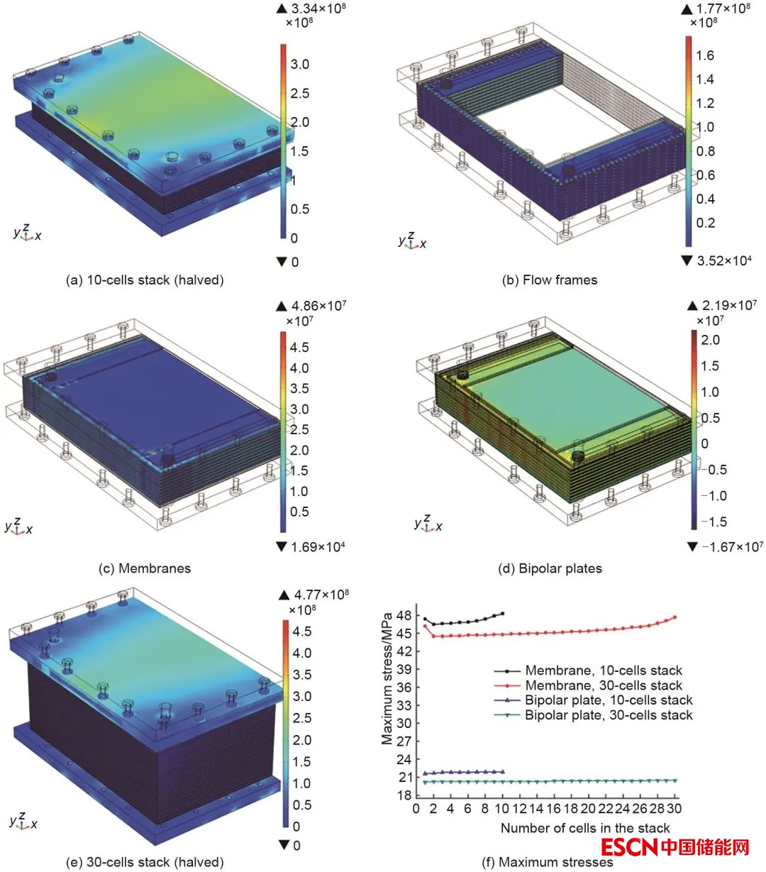 高功率電堆的設計開發(fā)不僅需要優(yōu)化流場設計,還需要考慮電堆裝配的力學特性和各關鍵材料的受力情況。在高功率電堆的裝配過程中,不當?shù)难b配應力可引起材料結構變形影響功能性甚至導致材料力學失效,如引發(fā)雙極板或者導流板的開裂、隔膜的變薄褶皺甚至撕裂、密封墊的失彈等問題,導致電堆性能下降、壽命縮短和漏液。絕大多數(shù)電堆在設計和制備過程中,其內(nèi)部組件的力學行為以及機械失效問題尚不清晰,力學狀態(tài)對電化學特性的影響機制也尚不明確,而傳統(tǒng)實驗方法難以實現(xiàn)對大尺寸高功率電堆的結構進行準確有效的力學分析。針對這一問題,中科院金屬所Xiong等[25]采用有限元分析手段,基于胡可定律構建了高功率液流電池單體電堆的三維結構力學模型,系統(tǒng)研究了單電池和電堆中隔膜、雙極板、導流板等關鍵組件上的應力分布特性,分析了電池中各關鍵組件的機械失效行為,此外還系統(tǒng)研究了不同密封設計對關鍵組件上應力分布形態(tài)的影響規(guī)律,以及電堆中的單電池組數(shù)與材料失效之間的關聯(lián)性。模擬仿真結果從理論層面系統(tǒng)揭示了電堆裝配力對電堆力學性能的影響規(guī)律,為電堆設計與裝配提供了有效指導(圖5)。