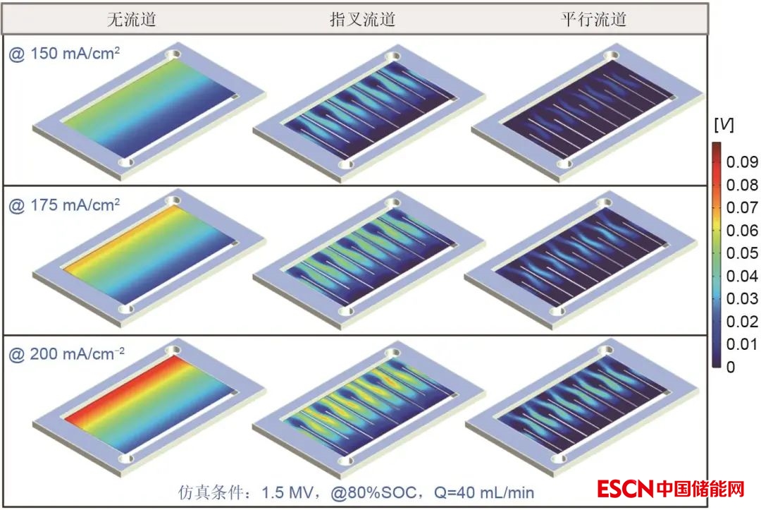 除新型流道結構設計,新南威爾士大學Gurieff等還提出了新幾何形狀的電極結構,可以顯著增加電池內(nèi)從入口到出口的電解液流速,改善在不同電荷狀態(tài)下電化學物質(zhì)向電極/電解質(zhì)界面上反應位點的傳遞。三維數(shù)值模擬顯示,梯形和徑向幾何形狀可以明顯加速電解液在電池堆棧中的流動。此外,還提出了一種新的幾何堆棧布局,該布局可以通過徑向位移單元提供更高的功率輸出(圖3)。東方電氣Yin等在活性面積為57.5 cm2的碳氈多孔電極上設計了一種叉指流場,并采用三維多物理場模型進行了模擬。數(shù)值結果中觀察到“葉子”形狀的離子濃度和電壓分布形式。在電解液流量的主要操作范圍內(nèi),與雙極板內(nèi)叉指流場和無流場設計相比,電極內(nèi)流場的流體壓降最小,系統(tǒng)效率最佳。該流場設計的電極大大降低了釩氧化還原液流電池的密封壓力要求,具有更好的可靠性。中科院金屬所Hao等進一步在炭氈電極上進行流場設計,三維數(shù)值模擬結果顯示,平行和叉指流道設計能夠顯著降低壓降、均勻反應物分布、減小濃差極化(圖4)。通過實驗進一步證實,采用平行流道設計電池相比無流道設計電池在200 mA/cm2時的放電容量顯著提高,電壓效率達到78%。最后,對32 kW電堆動態(tài)模型仿真表明,高電流密度下平行流道設計的電堆系統(tǒng)效率較使用原氈電堆可有效提升10%以上,表明炭氈表面的流場設計在實際液流電堆的設計和放大中具有較大潛力。