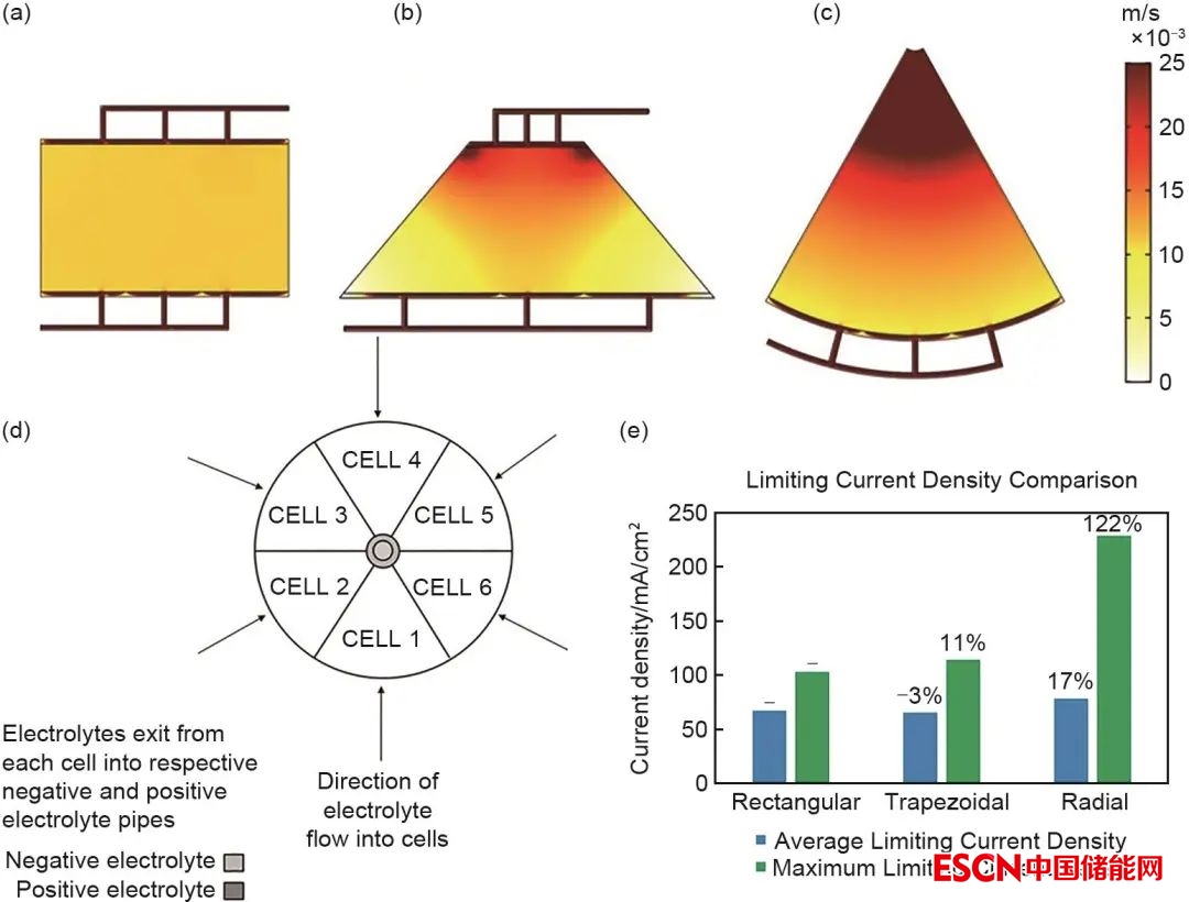 圖3 (a)~(c)不同電池結構下的速度等值線圖;(d)新型結構液流電池概念示意圖;(e)不同幾何結構下的平均和最大極限電流密度