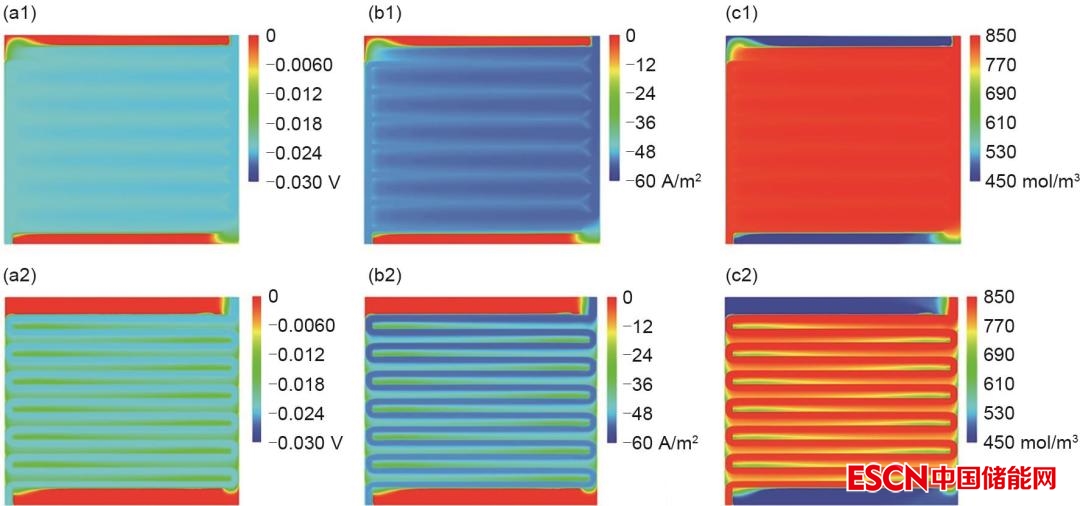 圖2 交錯流場和蛇形流場的(a) 過電位,(b) 局域電流密度和(c) 釩濃度分布