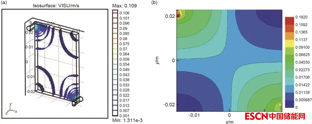 圖1 (a) 電極域內(nèi)速度等值面和(b) 電極/集流體界面模擬速度等值線圖