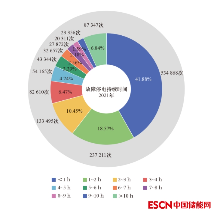 2021年,用戶故障停電平均持續(xù)時間為3.63 h/次,同比增加0.04 h/次。其中,城市地區(qū)用戶故障停電平均持續(xù)時間為3.43 h/次,同比增加0.17 h/次;農村地區(qū)用戶故障停電平均持續(xù)時間為3.71 h/次,同比增加0.03 h/次。其中,41.88%的故障停電能夠在1 h以內排除并恢復供電;18.57%的故障停電能夠在2 h以內排除并恢復供電;6.84%的故障停電恢復時間超過了10 h。2021年故障停電持續(xù)時間分布情況見圖17。