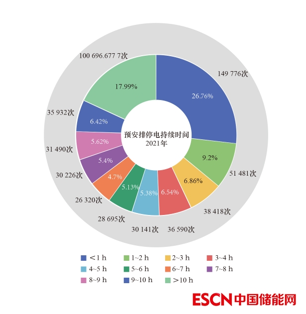 2021年,預安排停電平均持續(xù)時間6.88 h/次,同比增加0.34 h/次。其中,城市地區(qū)預安排停電平均持續(xù)時間6.49 h/次,同比增加0.63 h/次;農村地區(qū)預安排停電平均持續(xù)時間7.09 h/次,同比增加0.34 h/次。其中,26.76%的預安排停電在1h以內恢復供電;9.2%的預安排停電在2h以內恢復供電;17.99%的預安排停電恢復時間超過10 h。2021年預安排停電持續(xù)時間分布情況見圖16。