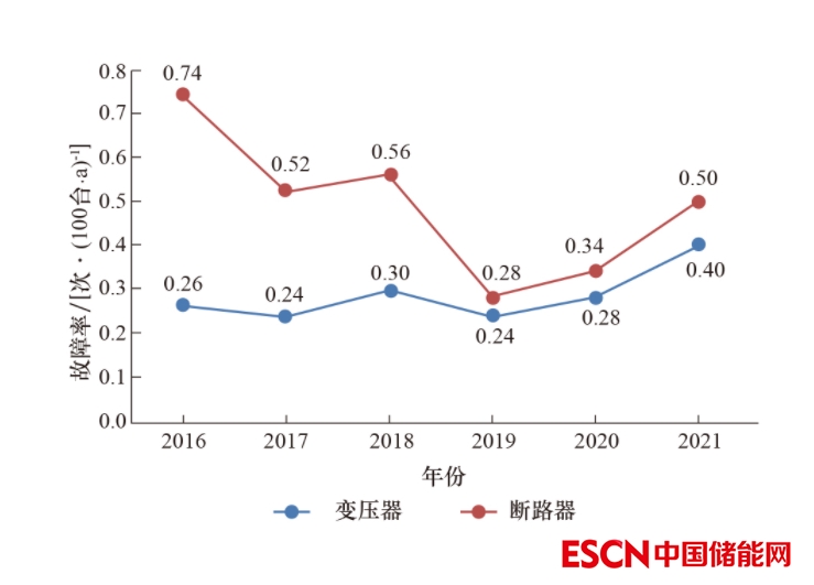 圖11 2016?2021年變壓器、斷路器故障率變化情況