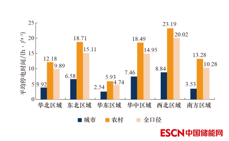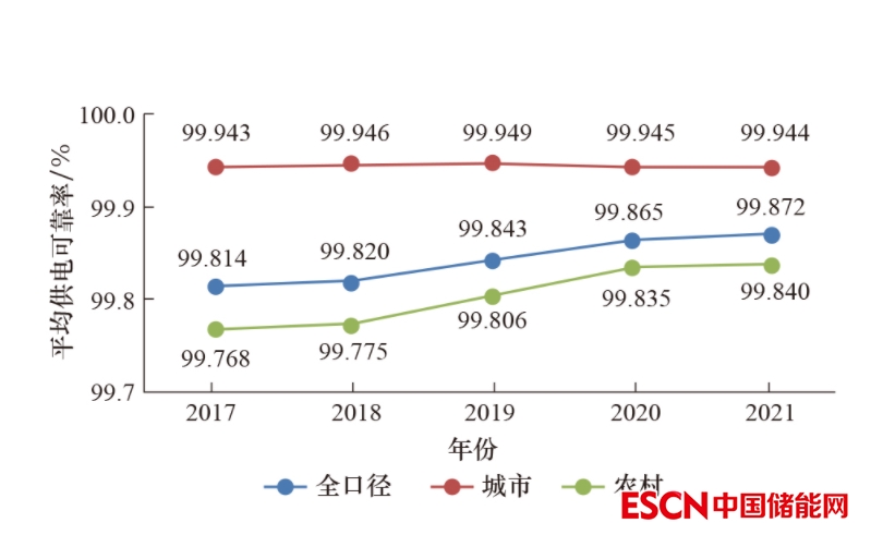 2021 年,全國供電系統(tǒng)用戶平均供電可靠率99.872%,同比上升0.007個百分點;用戶平均停電時間11.26 h/戶,同比減少0.61 h/戶;用戶平均停電頻率 2.77次/戶,同比增加0.08次/戶。其中,全國城市地區(qū)平均供電可靠率99.944%,農村地區(qū)平均供電可靠率 99.840%,城市、農村地區(qū)平均供電可靠率相差0.104個百分點;全國城市地區(qū)用戶平均停電時間4.89 h/戶,農村地區(qū)用戶平均停電時間14.06 h/戶,城市、農村地區(qū)用戶平均停電時間相差9.17 h/戶;全國城市地區(qū)用戶平均停電頻率1.24次/戶,農村地區(qū)用戶平均停電頻率3.45次/戶,城市、農村地區(qū)用戶平均停電頻率相差 2.21次/戶。