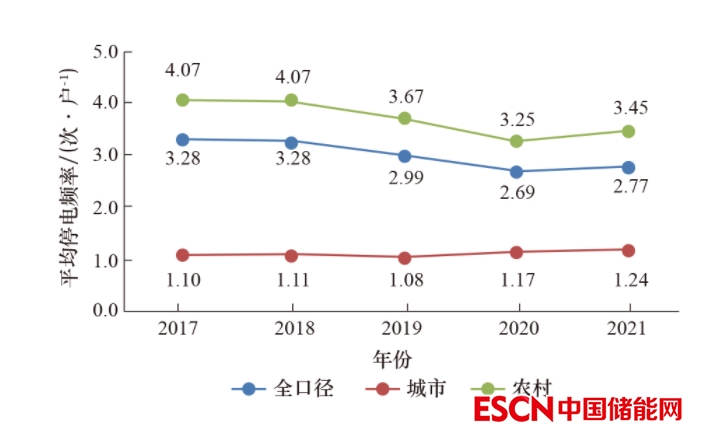 全國的用戶平均停電頻率由2017年的3.28次/戶下降至2.77次/戶,下降了0.51次/戶,其中城市地區(qū)的用戶平均停電頻率由2017年的1.10次/戶上升至1.24次/戶,上升了0.14次/戶;農村地區(qū)的用戶平均停電頻率由2017年的4.07次/戶下降至3.45次/戶,下降了0.62次/戶。2017?2021年全國平均停電頻率變化情況見圖4。