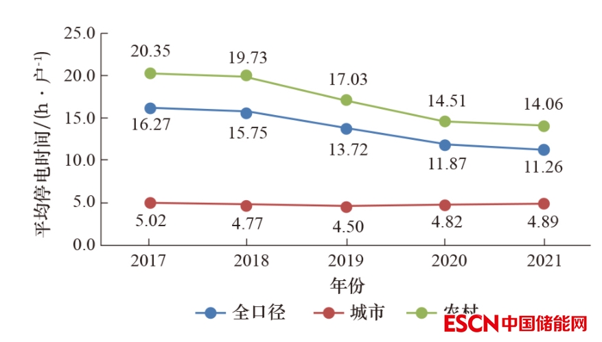 全國的用戶平均停電時間由2017年的16.27 h/戶下降至2021年的11.26 h/戶,下降了5.01 h/戶,其中城市地區(qū)的用戶平均停電時間由2017年的5.02 h/戶下降至 2021年的4.89 h/戶,下降了0.13 h/戶;農村地區(qū)的用戶平均停電時間由2017年的20.35 h/戶下降至2021年的14.06 h/戶,下降了6.29 h/戶。2017?2021年全國平均停電時間變化情況見圖3。