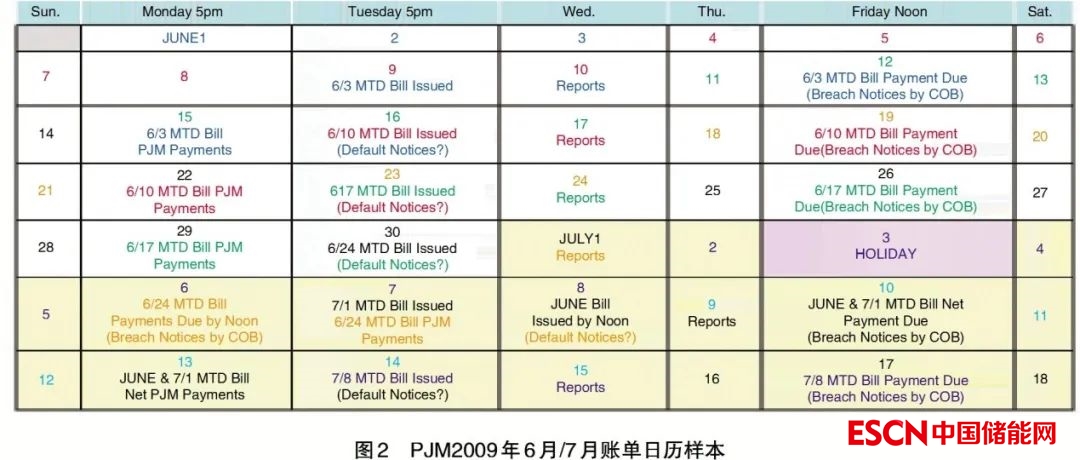 圖2是2009年6/7月PJM賬單日歷的示意圖,可以看到周賬單周期與月度賬單周期是如何協(xié)調(diào)的,以及對于跨月的結(jié)算是如何安排的??傮w來說,周賬單的發(fā)布遵循圖1的方式,在每個周賬單發(fā)布后的3個自然日(除公眾假期)為付款到期日,付款到期日后的下一個工作日為付款日期。圖中截至6月3日的賬單,是在6月9日發(fā)布,6月12日為付款到期日,6月15日完成付款;截至6月24日周賬單的付款到期日應(yīng)為7月3日,但是由于這天是公眾假期,因此順延至7月6日。如果有跨月的情況,則月初不滿一周的部分仍將作為第一個周結(jié)算周期,6月第一個周結(jié)算覆蓋日期為6月1~3日;月末的部分將作為月度賬單的一部分在下一個月的第5個工作日發(fā)布,不再單獨發(fā)布周賬單,圖中6月25~30日的結(jié)算賬單將不單獨發(fā)布,而是與6月的月度賬單一并于7月8日發(fā)布。上一個月的月度賬單將與下一個月第一個周結(jié)算一同進行結(jié)算,圖中7月10日為6月月度賬單及截至7月1日的周賬單的付款到期日,7月13日為付款日。月度賬單中囊括了周賬單中的所有科目明細,結(jié)算金額大約占總賬單金額的95%,且月度賬單中還包括對上一個月的賬單調(diào)整內(nèi)容,相關(guān)結(jié)算調(diào)整金額將計入最近一次的周賬單結(jié)算金額中。從PJM結(jié)算實踐來看,結(jié)算環(huán)節(jié)不管是規(guī)則編寫還是流程安排,都應(yīng)盡可能做到公開、透明,且盡可能要細致,才能讓市場主體能夠有據(jù)可查,減少不必要的爭議。