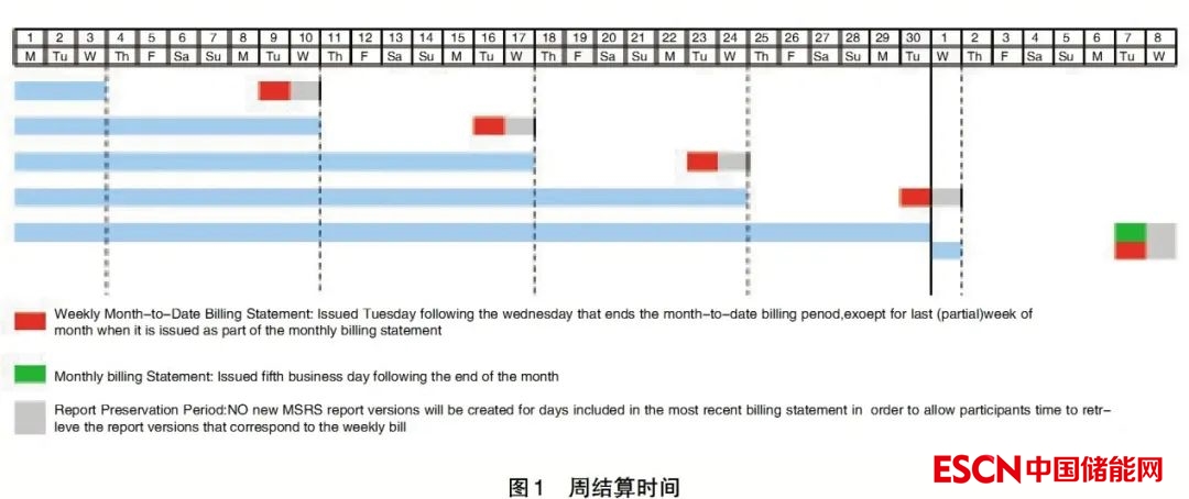 二是結(jié)算流程較規(guī)范、關(guān)鍵節(jié)點提前公布。結(jié)算流程清晰、各環(huán)節(jié)銜接流暢、結(jié)算時間透明是成熟電力市場結(jié)算“日歷”制定的特點。鑒于結(jié)算服務(wù)屬于運營機構(gòu)提供的服務(wù)工作,對市場主體“友好”是重要的工作要求,至于是否會加大工作量并不是首要考慮的內(nèi)容。例如,PJM結(jié)算公司會根據(jù)規(guī)則,在每個結(jié)算周期提前公布的結(jié)算日歷,分別出具周賬單和月度賬單,賬單通過PJM市場結(jié)算報告系統(tǒng)(MSRS)以PDF的形式發(fā)送給用戶。同時,還會發(fā)布月內(nèi)滾動更新的結(jié)算報告,以便市場成員和輸電服務(wù)用戶及時驗證電子賬單上的相關(guān)信息。此外,PJM結(jié)算服務(wù)還會在市場結(jié)算報告系統(tǒng)中發(fā)布客戶指南,其中會具體描述賬單中所涵蓋的逐項費用及計算過程。圖1和圖2就是結(jié)算客戶指南中的結(jié)算日歷示例。