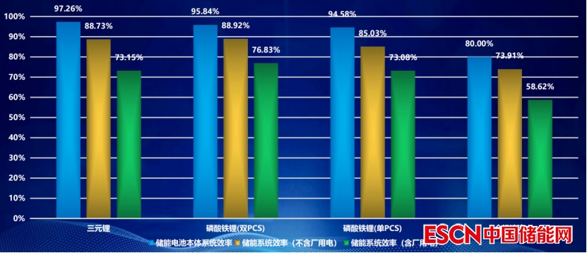 中國儲(chǔ)能網(wǎng)訊:大慶基地儲(chǔ)能產(chǎn)品實(shí)證板塊涵蓋6個(gè)廠家7種不同儲(chǔ)能技術(shù)類型,包括電化學(xué)儲(chǔ)能、電磁儲(chǔ)能、機(jī)械儲(chǔ)能三大類技術(shù), 涵蓋磷酸鐵鋰、三元鋰、鈦酸鋰、全釩液流、超級(jí)電容、混合電容、飛輪儲(chǔ)能。從系統(tǒng)效率來看,儲(chǔ)能電池本體系統(tǒng)效率較高,可達(dá)到承諾值。儲(chǔ)能系統(tǒng)增加PCS、功率轉(zhuǎn)換器件損耗后,特別是空調(diào)或泵自耗電后,系統(tǒng)效率偏低。