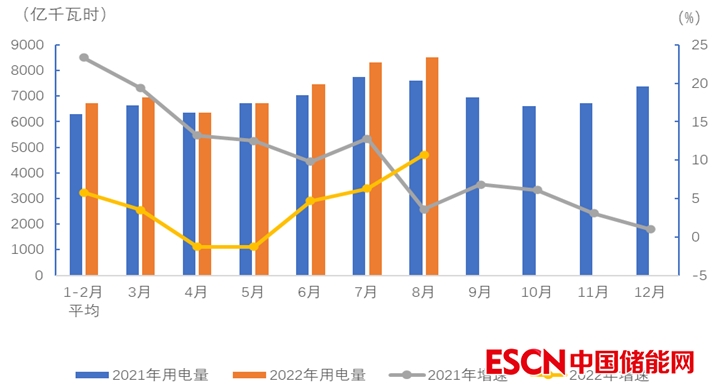 8月份,東、中、西部和東北地區(qū)全社會用電量增速分別為8.6%、22.3%、8.6%和0.2%。