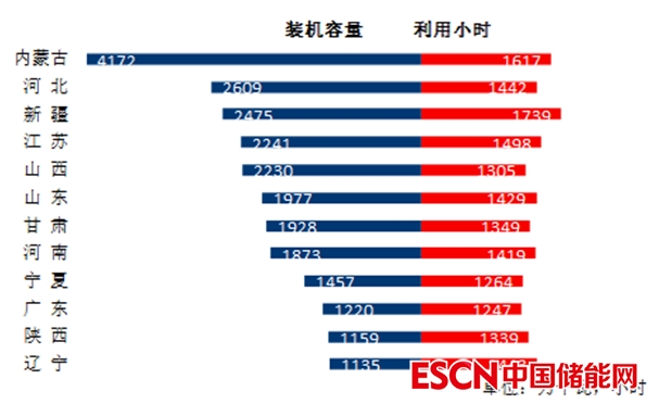 圖3 1-8月份風(fēng)電裝機(jī)較多省份風(fēng)電裝機(jī)容量和設(shè)備利用小時(shí)