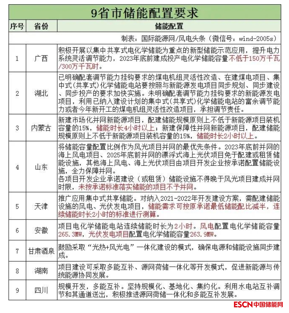 國際能源網(wǎng)/風(fēng)電頭條(微信號:wind-2005s)梳理,廣西、湖北、內(nèi)蒙古、山東、天津、安徽、甘肅酒泉、湖南、四川9省市明確風(fēng)光配套儲能。