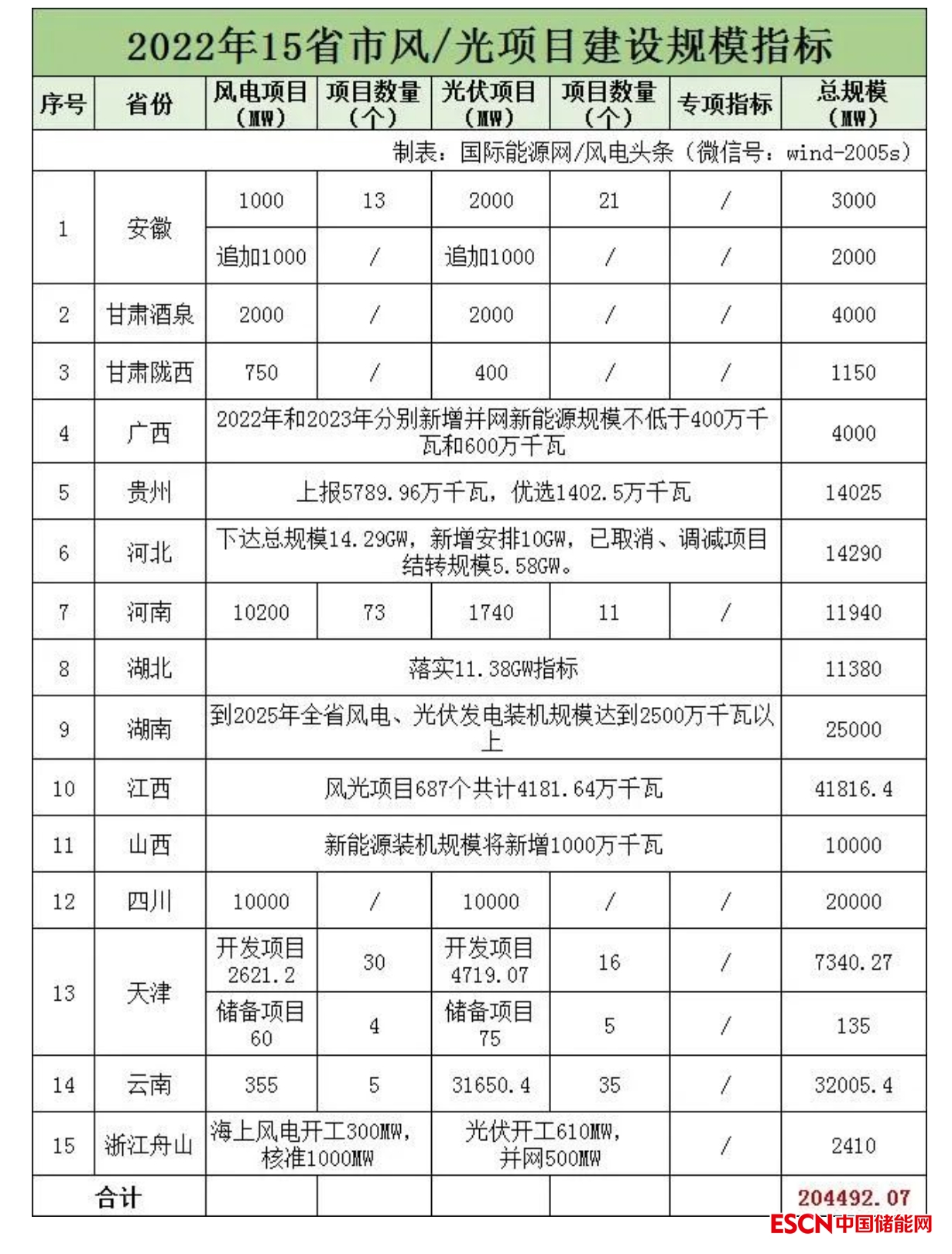 中國儲能網(wǎng)訊:據(jù)不完全統(tǒng)計(jì)了2022年各省對風(fēng)電、光伏下達(dá)的建設(shè)方案政策,下發(fā)政策的省份有安徽、廣西、貴州、河北、河南、湖北、湖南、江西、內(nèi)蒙古、山西、四川、天津、云南、浙江舟山、山東、甘肅酒泉、甘肅隴西17省市。其中有15省市明確了風(fēng)電、光伏發(fā)電規(guī)模指標(biāo),總規(guī)模達(dá)204492.07MW(約204.49GW),有9省市明確儲能配置要求。