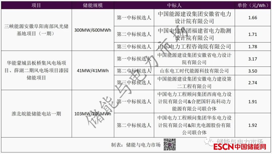 表 安徽已完成EPC招標(biāo)的儲(chǔ)能項(xiàng)目和價(jià)格情況