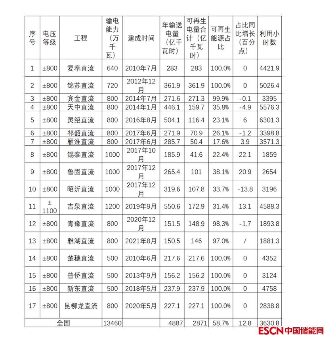 2021年,我國(guó)在運(yùn)直流特高壓共計(jì)17條,總輸電能力約1.34億千瓦時(shí)。通報(bào)顯示直流特高壓全年輸送電量4887億千瓦時(shí),其中可再生能源電量2871億千瓦時(shí),同比提高18.3%,可再生能源電量占全部輸送電量的58.7%。根據(jù)統(tǒng)計(jì)直流特高壓的輸電能力,2021年全國(guó)直流特高壓的平均輸電小時(shí)數(shù)約為3630小時(shí)。各直流輸電情況見(jiàn)表1: