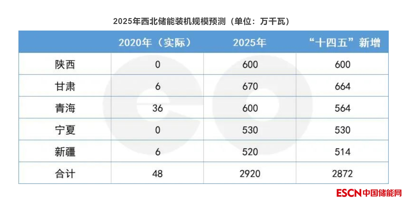 2020年時,陜西、寧夏等省區(qū)還沒有儲能裝機,新疆、甘肅等省區(qū)儲能的裝機規(guī)模都比較小,青海儲能規(guī)模相對較大。我們曾預測,到2025年,西北各省區(qū)儲能規(guī)模都在500萬千瓦以上(詳見下表)。但從后續(xù)各省區(qū)發(fā)布的規(guī)劃來看,裝機規(guī)模應該會大于預測值。