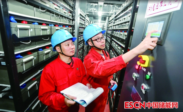 長興縣10千伏雉城儲能電站,國網長興縣供電公司的工作人員正在BMS電池管理系統(tǒng)監(jiān)控顯示屏上核對該組電池狀態(tài)