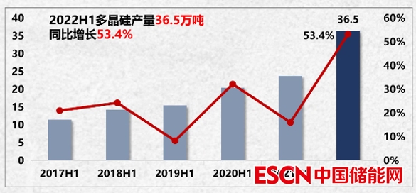 2022年上半年,全球多晶硅在產(chǎn)企業(yè)19家,總產(chǎn)能116.7萬噸/年,上半年總產(chǎn)量約44.8萬噸。全球前10多晶硅企業(yè)產(chǎn)能之和為97.4萬噸/年,中國占7家,產(chǎn)能之和為83.7萬噸/年,占比86%;其他三家分別是德國Wacker、美國Hemlock和韓國OCI,產(chǎn)能之和13.7萬噸/年,占比14%。截至2022年6月30日,中國在產(chǎn)多晶硅企業(yè)13家,上半年產(chǎn)量約36.4萬噸,同比增加53.4%,世界占比81.2%。
