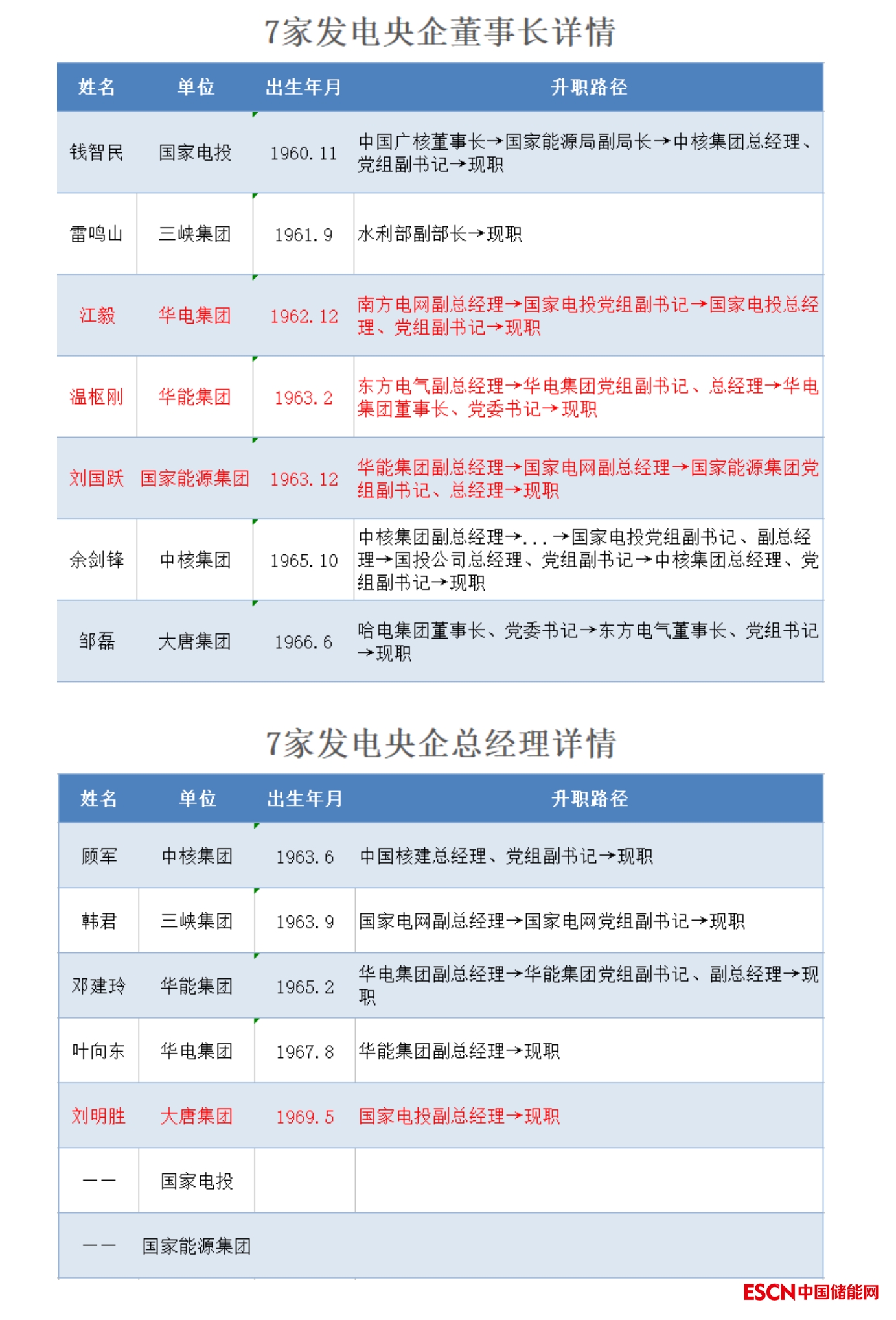 以下是7家副部級(jí)發(fā)電央企董事長(zhǎng)和總經(jīng)理的詳細(xì)情況(按年齡排序,標(biāo)紅者為今年新上任)。