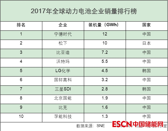 在2016年全球動力電池企業(yè)銷量排名中,前十有七家企業(yè)來自中國,依次為比亞迪、CATL、沃特瑪、國軒高科、力神、比克以及中航鋰電。中國鋰電開始在全球動力電池市場里初露鋒芒,并擁有了一席之地。而當(dāng)年的銷量第一正是日本的松下,其全年銷量達(dá)7.2GWh。
