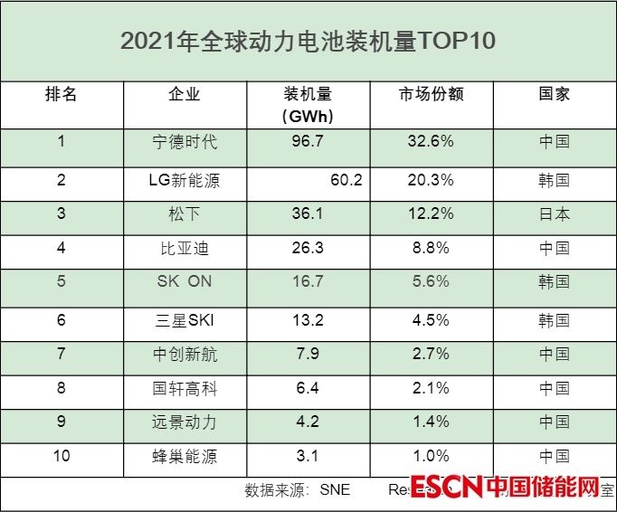 2021年,全球動力電池總裝機量為296.8GWh,同比增長102%,寧德時代以32.6%的份額占據(jù)絕對優(yōu)勢,排名第二的 LG 新能源市場份額占到了20.28%,排在第五和第六的SK ON與三星SDI的市占份額分別為5.6%、4.5%。