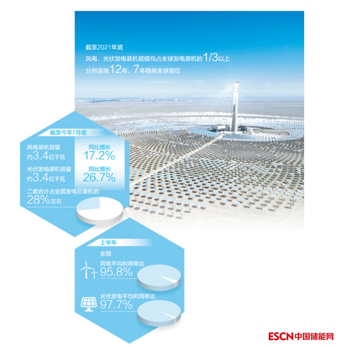 今年以來,我國新能源裝機規(guī)模穩(wěn)步擴大。截至7月底,風電裝機容量約3.4億千瓦,同比增長17.2%;光伏發(fā)電裝機容量約3.4億千瓦,同比增長26.7%;二者合計占全國發(fā)電總裝機的28%左右。同時,新能源消納利用水平不斷提升。上半年,全國風電、光伏發(fā)電平均利用率分別達到95.8%、97.7%,12個省份“風光”利用率達到100%。