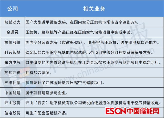 壓縮空氣儲能的產(chǎn)業(yè)鏈主要分為上游設(shè)備、資源供應(yīng):核心設(shè)備包括空氣壓縮機(jī)、透平膨脹機(jī)、蓄熱換熱系統(tǒng)等,此外還需要儲氣鹽穴資源等;中游領(lǐng)域?yàn)榧夹g(shù)提供與項(xiàng)目建設(shè);下游為電網(wǎng)系統(tǒng)。據(jù)《科創(chuàng)板日報(bào)》不完全統(tǒng)計(jì),這些A股上市公司已展開布局: