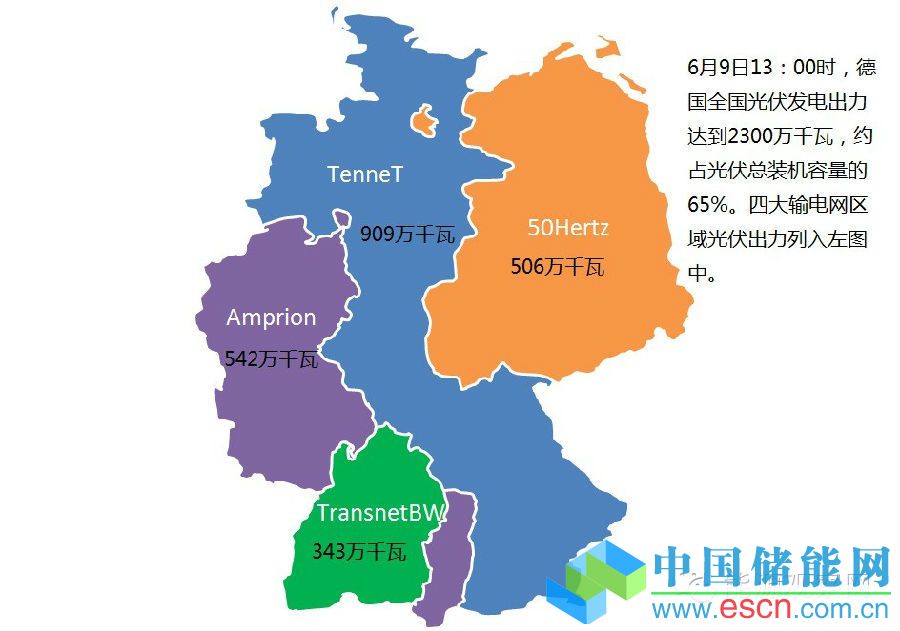 德國國土面積大概36萬平方公里,比我國四川省面積還小,南北直線距離為876公里,東西直線距離為640公里,所以太陽輻照的全國一致性比較好,光伏出力的同時率也比較高。6月9日13:00時德國光伏出力達(dá)到2300萬千瓦,而光伏發(fā)電總裝機(jī)約3500萬千瓦,光伏最大出力占裝機(jī)容量的比例約65%。6月9日13:00四大輸電網(wǎng)區(qū)域光伏出力分布圖如圖2所示。