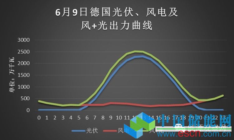 一般認(rèn)為,風(fēng)電和光伏出力均具有波動性,但是兩者擬合之后的出力曲線的波動性會減弱,德國是否也負(fù)荷這一規(guī)律呢?還是讓事實說話。我們發(fā)現(xiàn),當(dāng)日德國風(fēng)電出力非常弱,全天波動性并不大,基本維持在300萬千瓦左右,這相對于全國3300萬千瓦左右的風(fēng)電裝機(jī)來說確實小的可憐,風(fēng)電出力占風(fēng)電裝機(jī)容量的比重僅為10%左右。中午光伏大發(fā)時段,風(fēng)電出力也沒有明顯波動,所以風(fēng)+光的出力曲線與光伏出力曲線走向非常吻合。當(dāng)然,這只能代表6月9日這一天的情況。