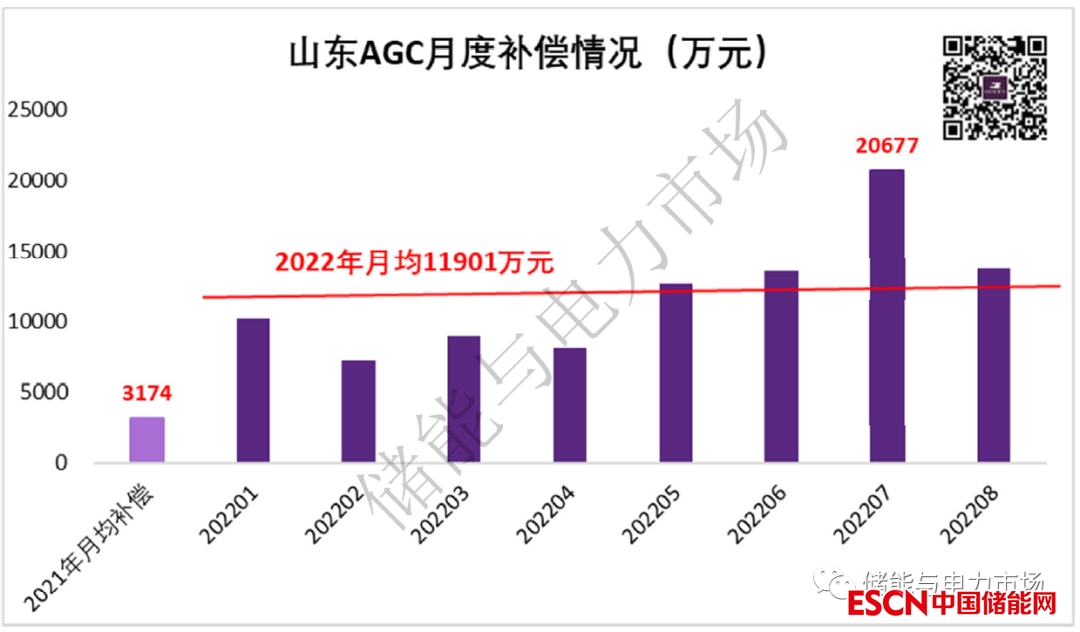 早在今年1月,山東調(diào)頻補(bǔ)償曾首次過(guò)億,達(dá)到了1.02億元。2022年持續(xù)的運(yùn)行數(shù)據(jù)顯示,山東的AGC調(diào)頻輔助服務(wù)補(bǔ)償量暴漲的趨勢(shì)并非曇花一現(xiàn),1-8月間,超過(guò)5個(gè)月份補(bǔ)償過(guò)億,2022年7月一度高達(dá)2億元。(詳見(jiàn):調(diào)頻補(bǔ)償超1億,現(xiàn)貨價(jià)差超1元/kWh,山東儲(chǔ)能想象空間很大)。