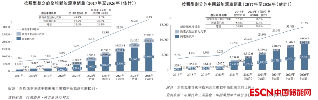 動(dòng)力電池行業(yè)的爆發(fā),離不開(kāi)下游新能源車(chē)的加速滲透。根據(jù)弗若斯特沙利文的數(shù)據(jù),2021年全球新能源車(chē)滲透率已經(jīng)來(lái)到9.7%。全球新能源車(chē)在過(guò)去5年的復(fù)合增長(zhǎng)率達(dá)到52.0%,預(yù)計(jì)在未來(lái)5年還將保持24.3%左右的增速增長(zhǎng)。