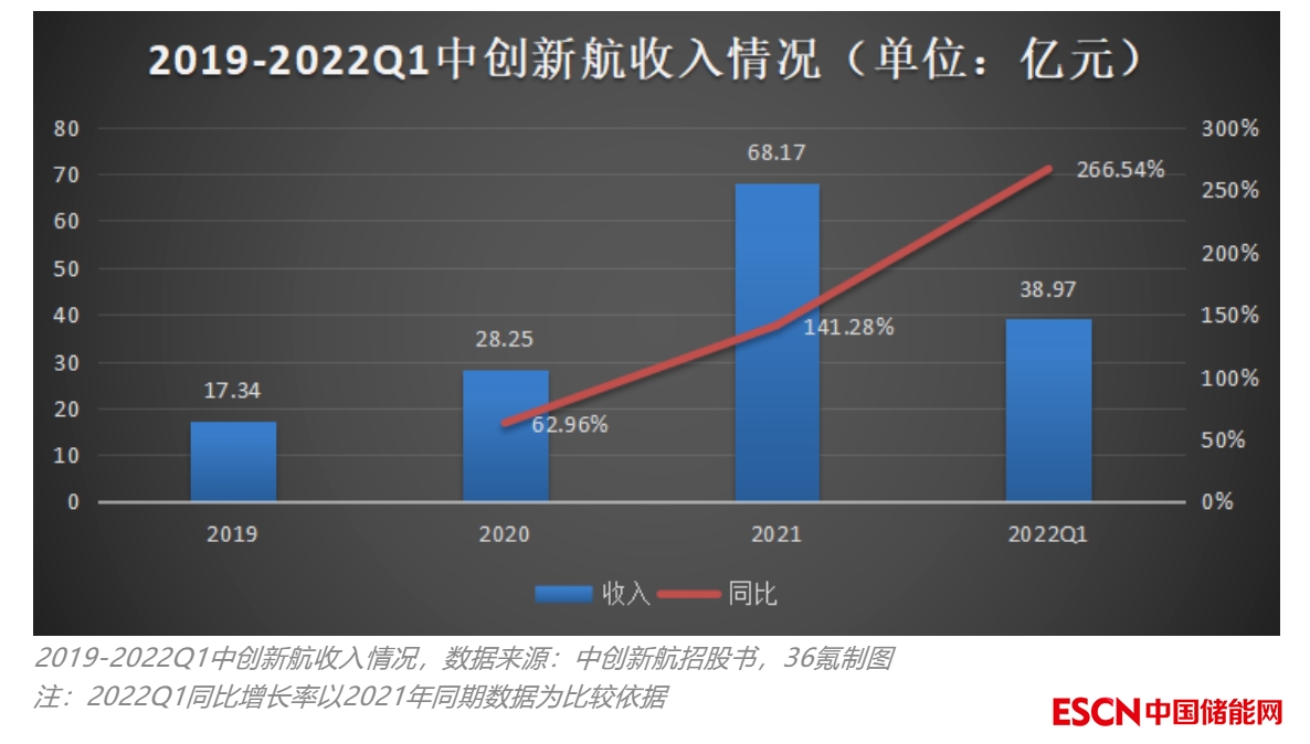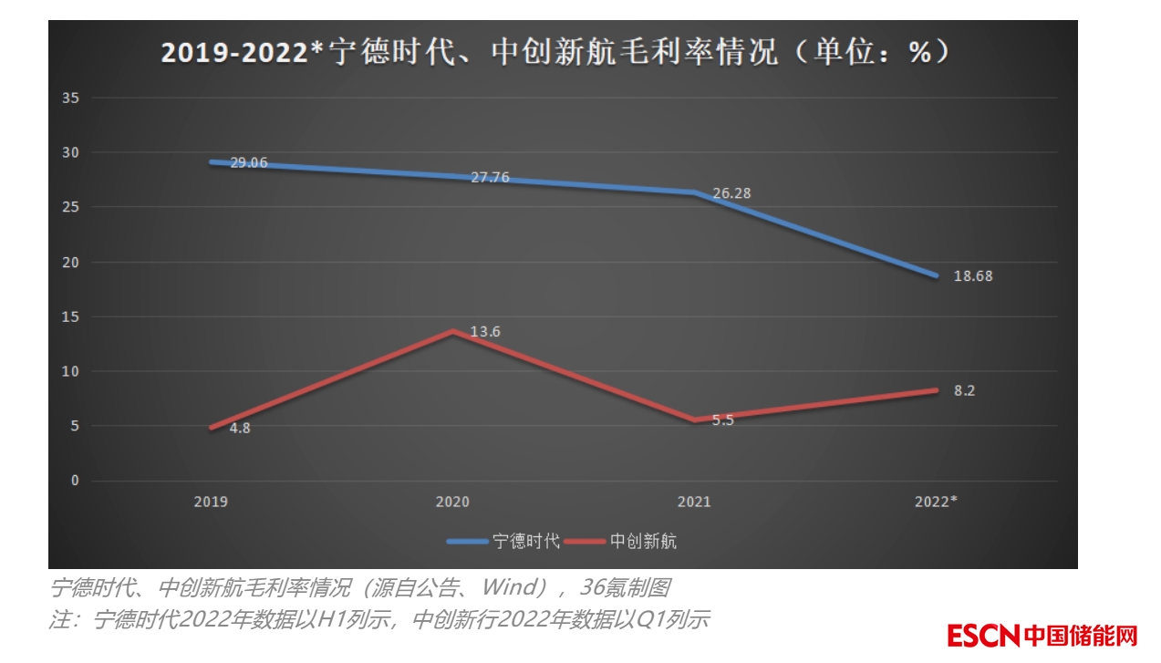這就導(dǎo)致寧德時(shí)代在儲(chǔ)能上的毛利率降到了2022年H1的6.4%,同比下降了30%;中創(chuàng)新航在該業(yè)務(wù)的毛利率在2022年Q1為-7.9%,較2021年Q1的+13.9%下降了20%以上。根據(jù)東吳證券研究所數(shù)據(jù),儲(chǔ)能業(yè)務(wù)預(yù)計(jì)能給寧德時(shí)代貢獻(xiàn)8億+的營(yíng)收,再看中創(chuàng)新航,在手訂單4.22億。二者如影隨形。
