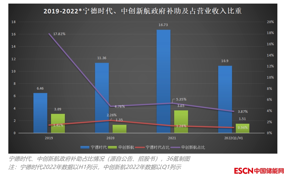 這個(gè)現(xiàn)象不止中創(chuàng)新航一家,龍頭寧德時(shí)代收到的政府補(bǔ)助要多得多,只不過(guò)跟寧德時(shí)代的千億收入相比,占比顯得很小。