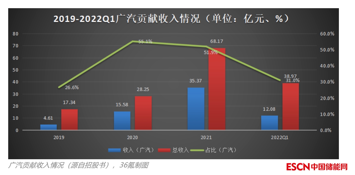 隨后的三年,廣汽集團(tuán)都和中創(chuàng)新航簽訂了戰(zhàn)略采購(gòu)協(xié)議。從金額上看,2019年廣汽集團(tuán)貢獻(xiàn)了中創(chuàng)新航收入的26.6%,這個(gè)比例在2020年就上升到了55.1%。2020年略有下降,在51.9%。
