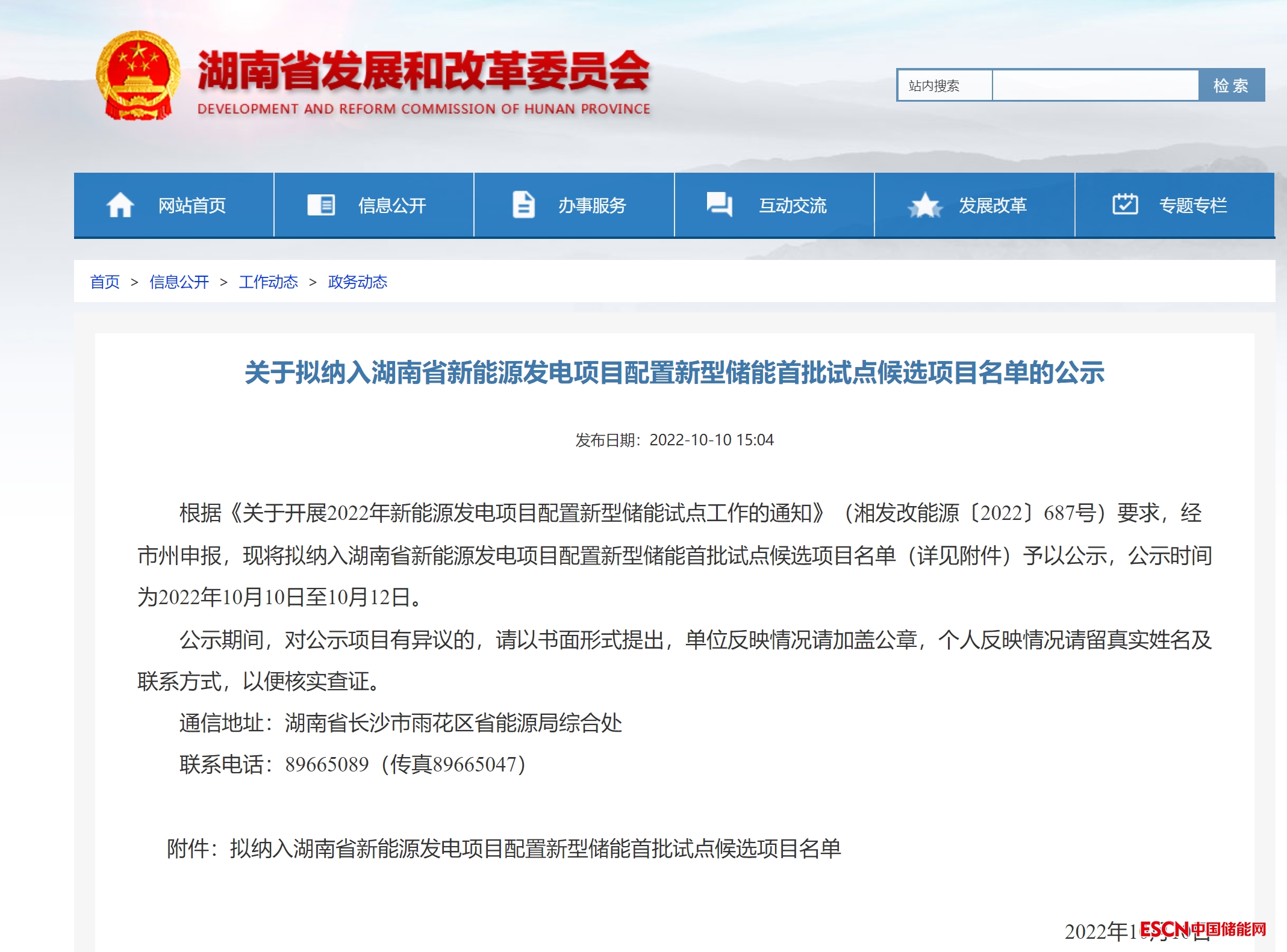 中國(guó)儲(chǔ)能網(wǎng)訊:根據(jù)《關(guān)于開(kāi)展2022年新能源發(fā)電項(xiàng)目配置新型儲(chǔ)能試點(diǎn)工作的通知》(湘發(fā)改能源〔2022〕687號(hào))要求,經(jīng)市州申報(bào),現(xiàn)將擬納入湖南省新能源發(fā)電項(xiàng)目配置新型儲(chǔ)能首批試點(diǎn)候選項(xiàng)目名單(詳見(jiàn)附件)予以公示,公示時(shí)間為2022年10月10日至10月12日。