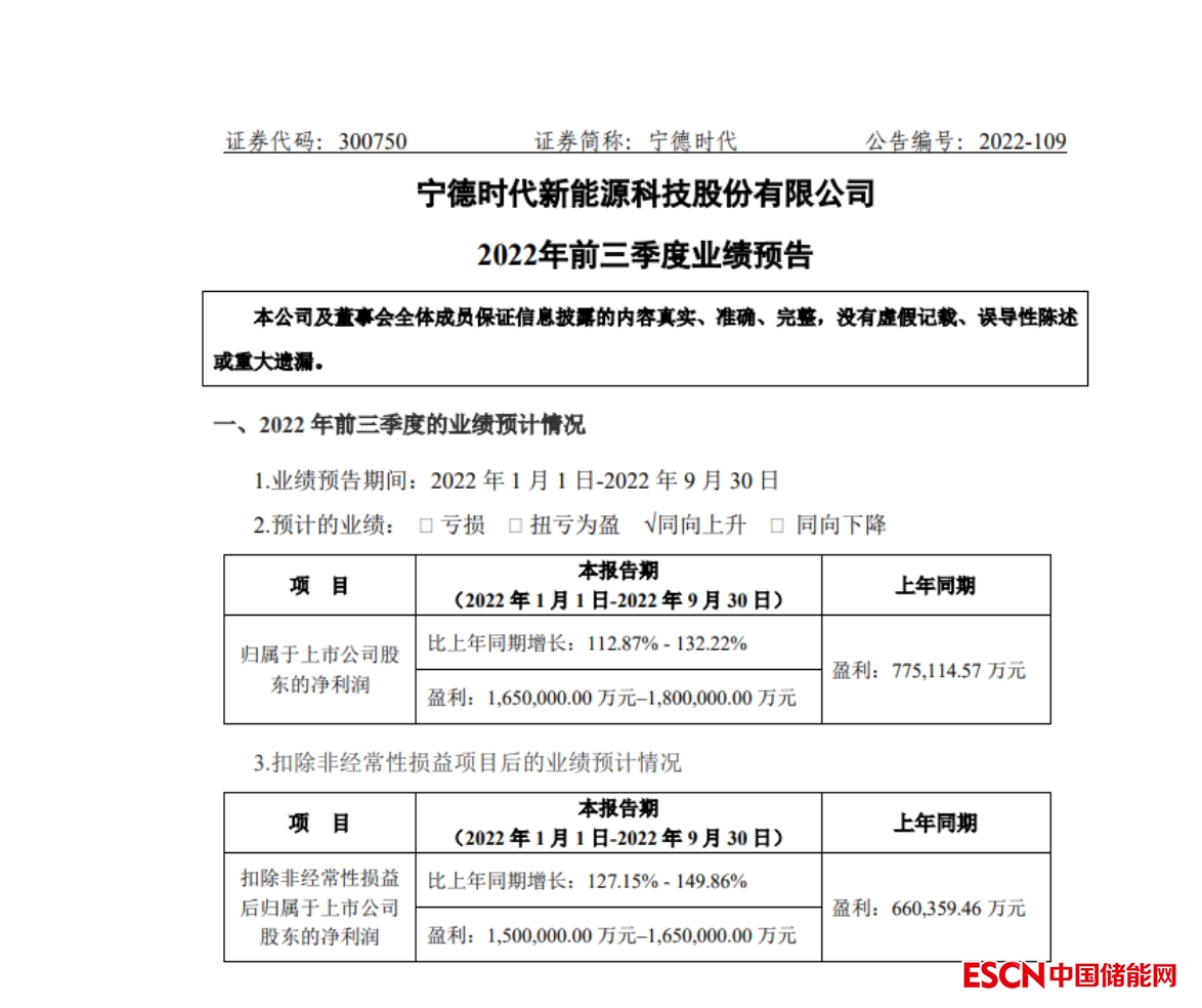 中國儲能網(wǎng)訊:10月10日晚間,寧德時代(SZ300750,股價392.86元,市值9588億元)發(fā)布2022年前三季度業(yè)績預(yù)告。業(yè)績預(yù)告顯示,寧德時代預(yù)計其2022年前三季度歸母凈利潤為165億~180億元,同比增長112.87%~132.22%。值得注意的是,這一數(shù)字已超過其2021年的歸母凈利潤(159.31億元)。