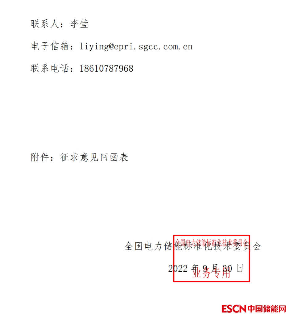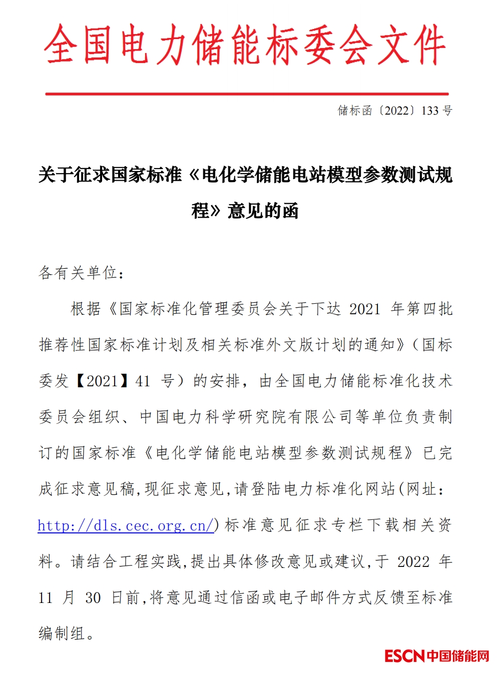 關(guān)于征求國(guó)家標(biāo)準(zhǔn)《電化學(xué)儲(chǔ)能電站模型參數(shù)測(cè)試規(guī)程》意見的函