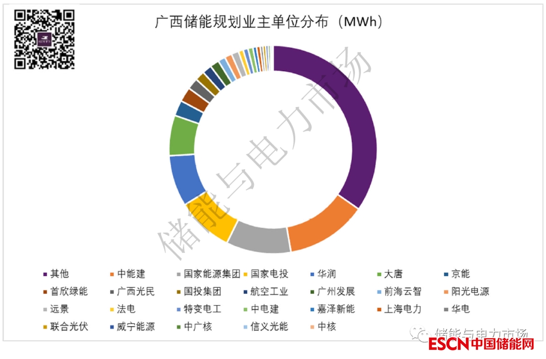 從競(jìng)爭(zhēng)性配置的實(shí)際情況上看,風(fēng)、光市場(chǎng)化項(xiàng)目均做到了15%-20%,儲(chǔ)能時(shí)長(zhǎng)2小時(shí)的儲(chǔ)能配置。新能源驅(qū)動(dòng)儲(chǔ)能發(fā)展在廣西十分明顯,儲(chǔ)能項(xiàng)目業(yè)主單位的分布情況也證明了這一情況。廣西的儲(chǔ)能項(xiàng)目實(shí)際買單方仍舊是新能源發(fā)電企業(yè)。