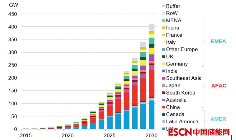 彭博社新能源財經(jīng)公司按區(qū)域劃分和預(yù)測的全球累計安裝儲能系統(tǒng)的裝機(jī)容量。RoW代表了“世界其他地區(qū)”和“緩沖區(qū)”市場以及調(diào)查能見度較低的用例