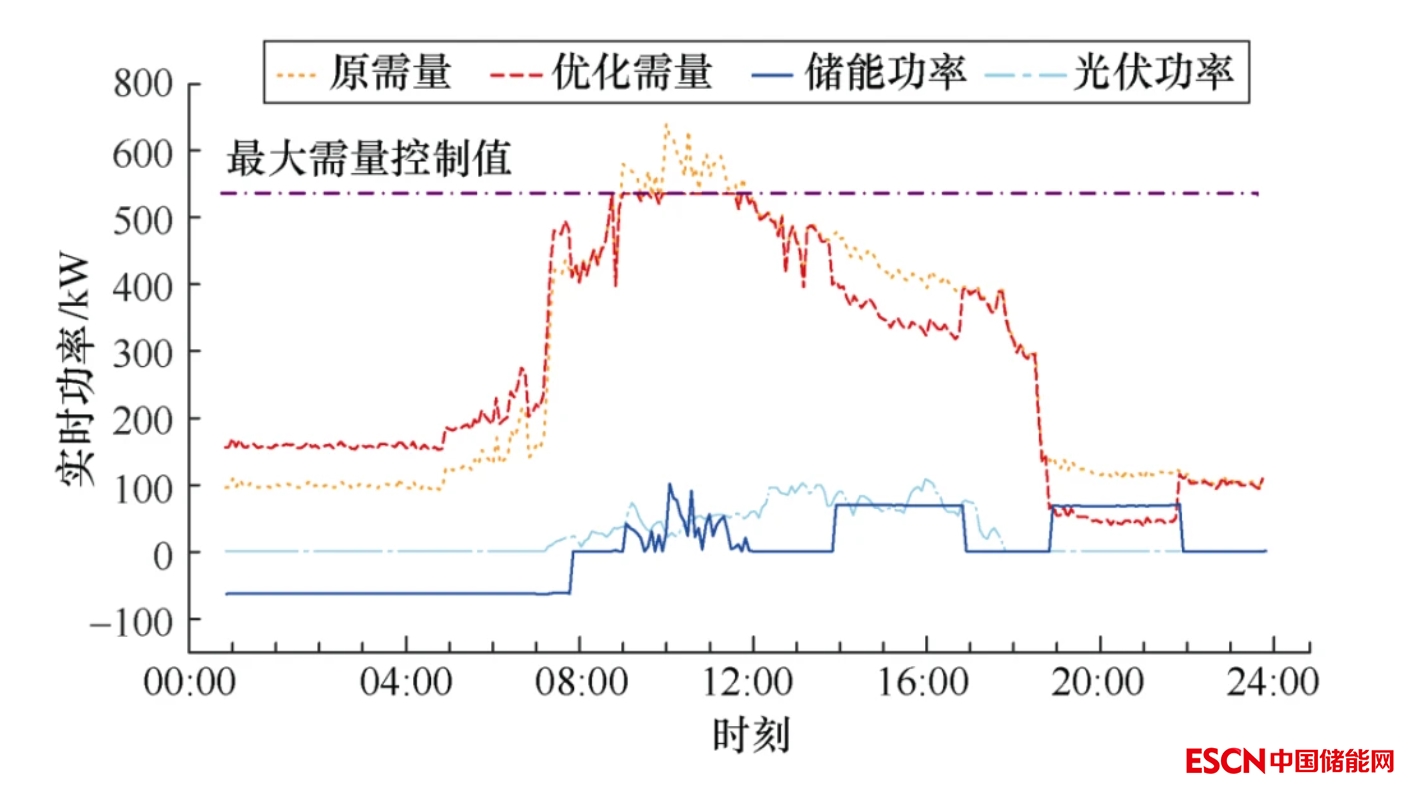 針對(duì)產(chǎn)業(yè)園10kV進(jìn)線的負(fù)荷曲線及其需量變化曲線進(jìn)行分析,并依據(jù)分時(shí)電價(jià),通過(guò)儲(chǔ)能充放電進(jìn)行負(fù)荷轉(zhuǎn)移、最大需量削峰。在負(fù)荷低谷時(shí)段充電、高峰時(shí)段放電,實(shí)現(xiàn)儲(chǔ)能參與需量控制下的能量管理,優(yōu)化策略實(shí)施效果如圖8所示。
