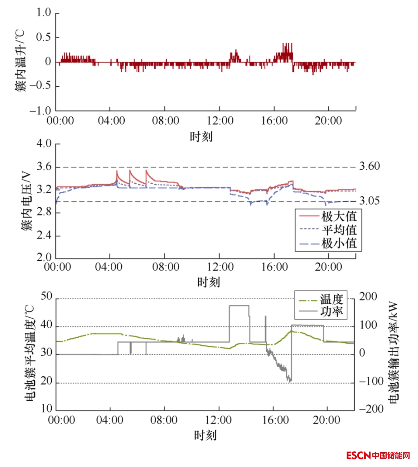 圖7 儲(chǔ)能簇內(nèi)電芯溫度、電壓曲線